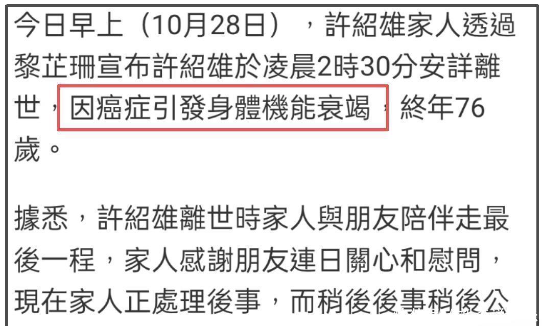 今天凌晨2点半,港媒爆出消息,这位76岁的TVB老戏骨因癌症引发多重器官衰竭,在医院安详离世。